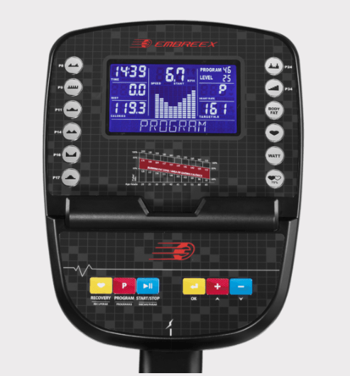 - Funções do Painel: velocidade, cronômetro, distância, queima calórica, nível de resistência, monitoramento cardíaco, Bluetooth para conectividade com apps de fitness e função especial Recovery para o acompanhamento da condição física do atleta;