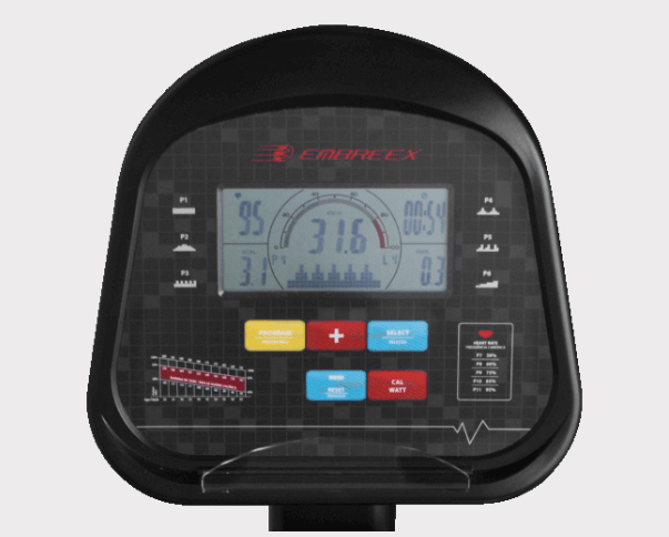 O painel LCD é de fácil operação e possui 11 programas de treinamento. Apresenta funções de velocidade, cronômetro, distância, queima calórica, potência, nível de resistência e monitoramento cardíaco.